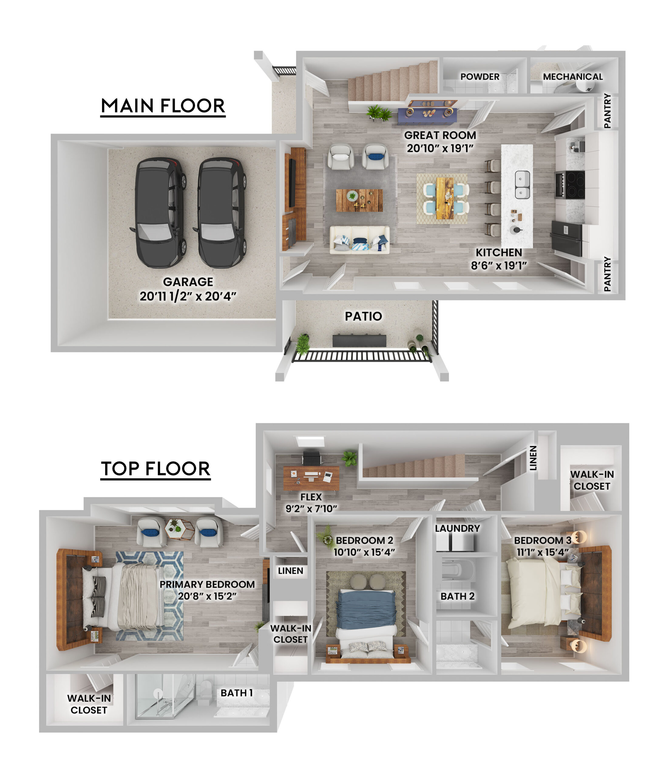*Floorplan renderings and photos are for illustrative purposes, actual finishes and materials installed in homes may be different. Features, amenities, floorplans, elevations, square footage and designs vary per plan and are subject to changes or substitution.